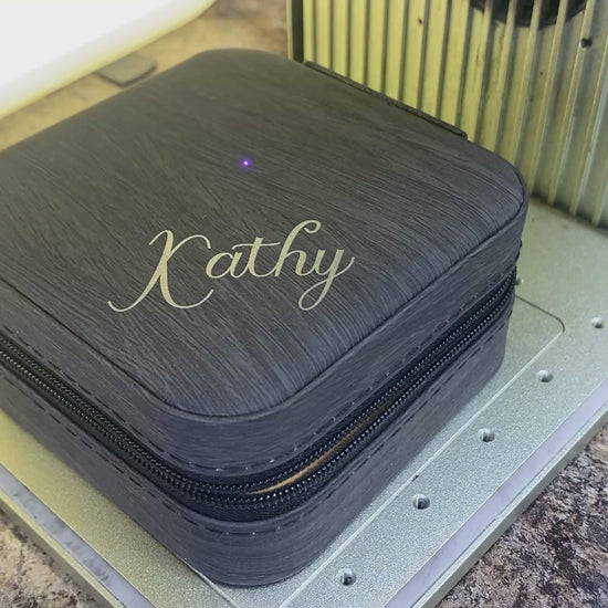 Keep your favorite pieces safe and stylish wherever you go with our Custom Engraved Travel Jewelry Box. Crafted from durable, leatherette material with a soft, sophisticated feel, this compact box is designed to protect and organize jewelry on the move. Available in four elegant finishes, each box reveals a hidden layer when engraved—pink and teal engrave to black, while white and light pink engrave to gold—making your personalization pop with stunning contrast. Perfectly sized at 4"" x 4", it fits easily into a purse, carry-on, or drawer while offering enough space to store rings, earrings, necklaces, and small keepsakes. ✨ Details: Material: Premium leatherette (laser-safe) Size: 4"" (L) x 4"" (W) Color Options: Pink (engraves black), Teal (engraves black), White (engraves gold), Light Pink (engraves gold) Compact & lightweight for easy travel Personalization: Engrave with a name, monogram, or special design Perfect for: Bridesmaids gifts, weddings, anniversaries, birthdays, or everyday use Whether for a weekend getaway, a bridal party gift, or a keepsake to treasure, this jewelry box is both practical and personal—a little luxury that travels with you.
