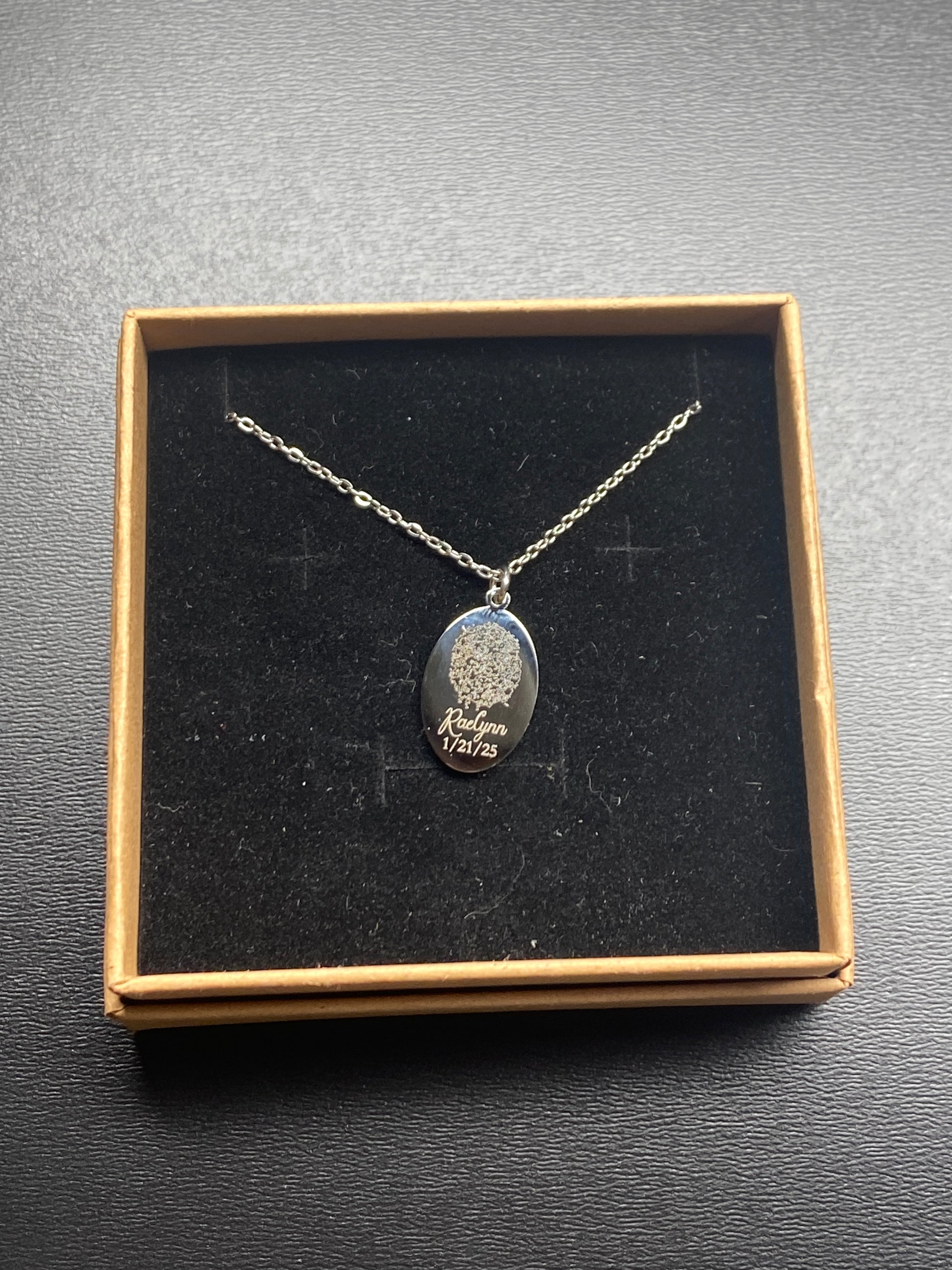Our Premium Custom Fingerprint Necklace transforms a single touch into a timeless piece of jewelry you’ll treasure forever. Each pendant is engraved from an actual fingerprint using our professional inkless fingerprint kit, capturing the exact ridges, lines, and details that make every person truly one-of-a-kind.